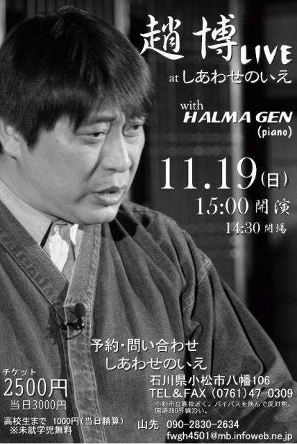 11/19(日) 趙 博 LIVE with HALMA GEN 14時半開場 15時開演 場所 しあわせのいえ 石川県小松市八幡106 TEL&FAX (0761)47-0309 http://map.yahoo.co.jp/pl?nl=36.23.53.683&el=136.29.33.503&la=1&fi=1&pref=%c0%d0%c0%ee&skey=%c0%d0%c0%ee%b8%a9%be%ae%be%be%bb%d4%c8%ac%c8%a8&sc=3 共演 HALMA GEN(ピアノ・アコーディオン) 大人 2500円 (当日3000円) 高校生まで 1000円(当日精算) ※未就学児無料 今年最後のイベント たくさんの人で、楽しく過ごせるといいなぁ。