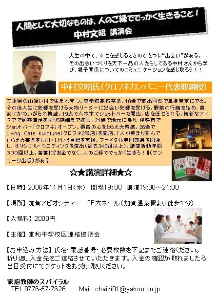 中村文昭さんの講演会が加賀市アビオシティー内で行なわれます。 北陸で講演を聴くことが出来る数少ないチャンスです。 参加希望の方は、チャイディーまでメッセージをくださいね。 【講演内容】 中学生のお子様をお持ちの保護者に対する『親子の関係および教育とは?』に関する内容です。 【日時】 2006年11月1日(水) 19:30〜21:00 【場所】 加賀アビオシティー 【地図】 http://map.yahoo.co.jp/pl?lat=36.18.58.806&lon=136.21.18.781&p=%A5%A2%A5%D3%A5%AA&ac=17&lnm=%A5%A2%A5%D3%A5%AA%A5%B7%A5%C6%A5%A3%B2%C