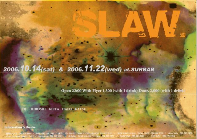 今月は偶数月にて平日開催! しか次の日、祝日だからお堅い仕事の人も大丈夫!! まぁあんま休みの人いないから関係ないか・・・ Open 22:00-- with flyer \1,500(w/1d) Door \2,000(w/1d) DJ's HIROSHI KEITA HAEO KATSU TOTAL INFO SUR BAR 099-222-0902 今度もヤバイよさ!!