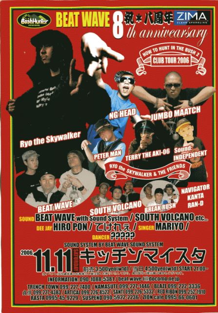 BEAT WAVE 8th ANNIVERSARYのチケット絶賛発売中でございます!! 3500yen【1ZIMA】 【チケット取り扱い店】 鹿児島市 TRENCH TOWN ARTICAL NAMASUTE 貞信 BLAZE SANTI RED RIBON SACCA 姶良 ZION CAFE 霧島市 RASTA 薩摩川内市 SUSPEND 各出演者の方々 いつもご協力ありがとうございます!! 尚、キャパの都合上、定員制限をさせていただく事がありますので、確実なチケット購入をお薦めします。 ヨロシクお願いします!!