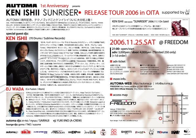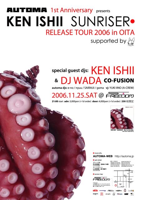 告知失礼致します。 大分テクノイベント「AUTOMA」 も今回で一周年迎えることになりました。 そして、今回のゲストはまさに 1st ANNIVERSARY に相応しい超スペシャルWゲスト! 東洋のテクノゴッドこと、ケンイシイ! No.1テクノDJ、Co-FusionのDJ WADA! 是非お見逃しなく! AUTOMA >> http://automa.jp ******************************************** AUTOMA 1st ANNIVERSARY presents KEN ISHII "SUNRISER" RELEASE TOUR 2006 in OITA ******************************************** 2006.11.25.SAT @ FREEDOM(大分)