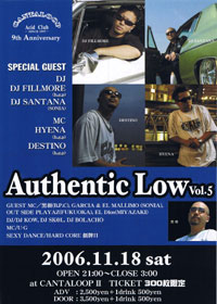 管理人様失礼致します 告知させて下さいmm ********************** 5年間お休みしていたクラブイベント Authentic Low 復活です!! スペシャルゲストに 旬なDJ&MCを迎え、 パワーアップした Authentic Low Vol.5 <チケット300枚限定です> Acid Club CANTALOOP Presents 〜9th Anniversary〜 カンタループ9周年を迎えることができました。 ありがとうございますmm Authentic Low Vol.5 2006・11・18(SAT) Open21:00〜Close3:00 at CANTALOOP? http://www.