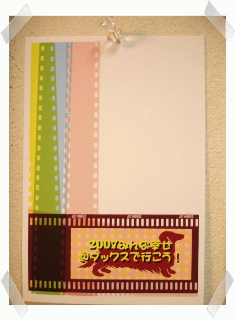 秋も深まってきた今日この頃、みなさんお元気ですか? 今年の7月8日に「@ダックスで行こう!」を開設して早4ヶ月が過ぎました☆ みなさんのおかげで、運営も順調ですしコミュニティの内容も充実してきています☆ 現在、参加者数1700名!!を突破いたしました。 本当にありがとうございます。 これを記念に今回は@ダックスで行こう!オリジナル2007年ニューイヤーカード【3枚1セット】を限定20名様にプレゼントいたします☆ ※デザインは写真参照で!! 写真をクリックすると拡大しますよ!! なお、締め切り