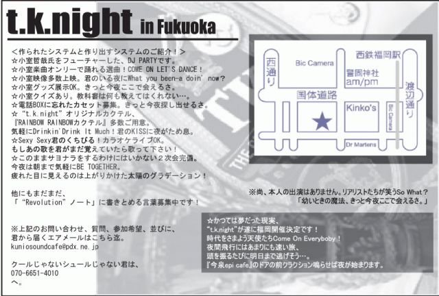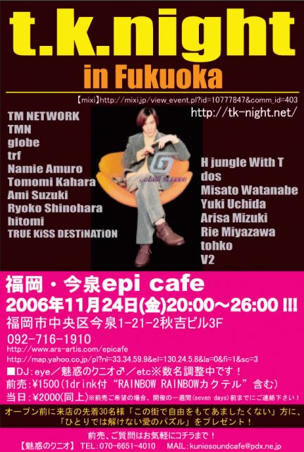 お待たせ致しました。 待望の詳細発表です。 “t.k.night”福岡開催のお知らせです。 この企画にご理解頂いた、 “epi cafe”の皆さんに感謝です! DJ Timeを中心にTK Soundの鳴り渡るフロアを、 是非とも体感頂ければと考えておりますよ。 各地開催同様に盛り上げて行きたいですね。 “t.k.night in Fukuoka” 日時:11/24(金)20:00〜26:00!※朝まで2次会完備! DJ:eye/魅惑のクニオ♂/etc※数名調整中です! VJ:清水&篠塚(映像提供) 場所:今泉epi cafe 092-716-1910 住所:福岡市中央区今泉1-21-2秋吉ビル3F http:/