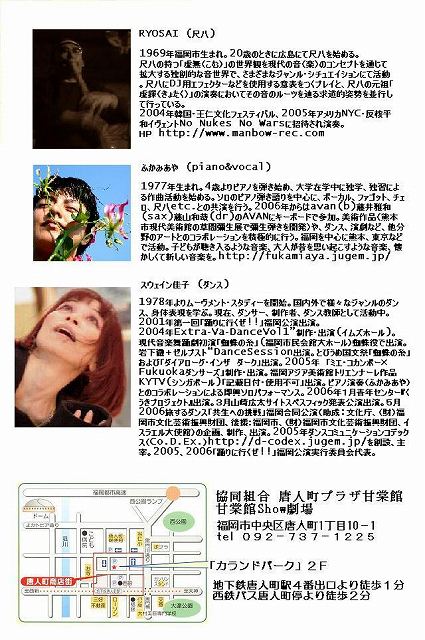 福岡を拠点に開催されるイベント Echoes (エコーズ) 。Electro , Alternative な空間の中で、Soul を持った Live が繰り広げられるコラボ空間。トラディショナルな民族音楽から始まる全ての音楽に通ずる、音楽が本来から持つパワーを有する Band , Dj 達と共に、体感するイベント。06'6 の一回目から、今回 Olive Oil , Folikan など8組が集結。