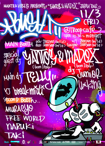 DJ TELLYが提唱する新感覚パーティー『Bush』。2006年には、DJ HYPER、ATOMIC HOOLIGAN、MC XANDER、RENNIE PILGREM、STANTON WARRIORSなどの世界のトップアーティストの関西公演を神戸で実現し成功をおさめる。今回は、ITALYよりSANTOSとMADOXを迎えての開催!!お楽しみに♪♪