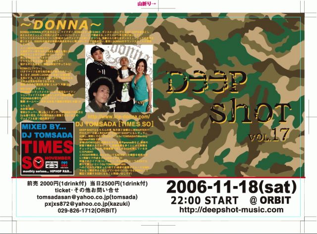 11月18日 DEEP SHOT@土浦ORBIT *DJ* TOMSADA MAKI HAGGY Z1MA K-TIP U(WORD OF MOUTH) *LIVE* DONNA(YOKOHAMA) BAY UZUKI P.T.C *DANCE* AT LOOP かなゆみこ ponpoco+RIKA GANG SISTA apricot *HOST MC* DJ FLAVOR(ROCK THE DEF) DEEP SHOT HP http://deepshot-music.com 今月もやってきました!!!! 今回のDEEP SHOT2006年最後ということで盛り上がることマチガイナシ☆ もちろんFLAVORさんもHOST MCと