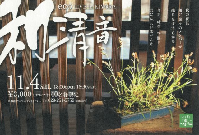 自分達で見たいライブを企画するというスタイルで話が進み、実現できることになりました。 和の空間でecoを堪能してください^^ 日時 11月4日(土) OPEN 18:00 START 18:30 場所 和風カフェ『清ら』 JR常磐線 赤塚駅南口徒歩2分 無料P有り チケット料金 ¥3,000 1ドリンク込み 他、軽食、スナック、甘味ものなど出す予定です。 人数限定 40名様 ご予約 清ら TEL 029−251−5759 (11:30〜18:00) メンバー eco (vo,key),山本