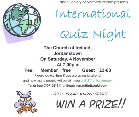 そういうわけで、日本協会では来る11月4日(土)にジョーダンスタウンの教会の部屋を借りて「インターナショナルクイズ大会」を開催することにしました。(出題は英語と日本語)商品も用意してありますので、ご家族、お友達を誘って奮って参加してください。