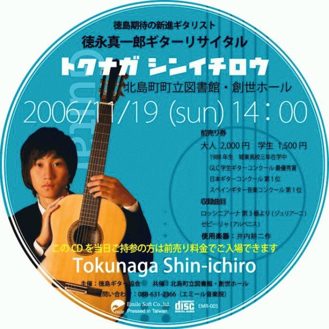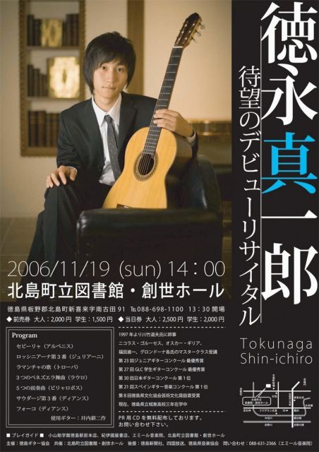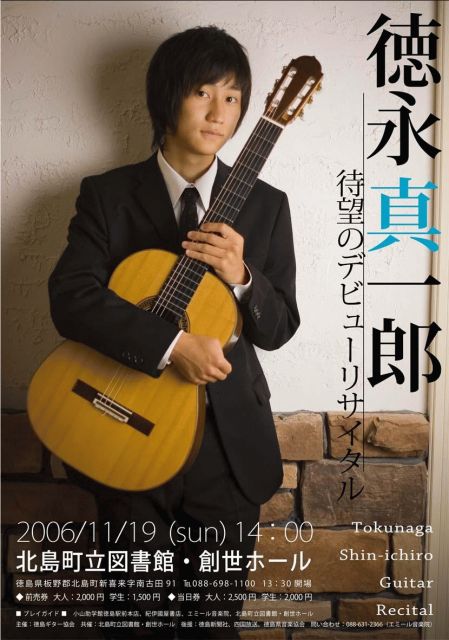 【徳永真一郎!】 待望のデューリサイタル 日時 2006年11月19日日曜 14:00開演 会場 北島町立図書館創世ホール 前売券大人2000円 学生1500円 当日各500円UP 主催 徳島ギター協会 http://www.guitar.gr.jp/tga/ 『徳永真一郎』〜略歴〜 1997年より川竹道夫に師事 ニコラス・ゴルセース、オスカー・ギリア、福田進一、 グロンドーナ各氏のマスタークラス受講 第27回GLC学生ギターコンクール最優秀賞 第30回日本ギターコンクール第1位 第21回スペインギター音楽コンクール第1位 第8回徳島県文化協会芸術文化奨励賞