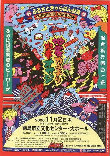 こんばんは。 度々イベントの紹介をしています。 11月2日(木)プロの劇団ふるさときゃらばん『地震カミナリ火事オヤジ』の裏方を募集します。 鳴門教育大学学食2階「ヤマザキパン」にてチラシ等を貼っているイベントの裏方スタッフです。 9時50分集合の方を20名弱ほど募集します。(昼から参戦、夕方授業終わってからの参戦OK!) スタッフとしてはプロの劇団員と共に 本格的な舞台セッティングを行います。小道具づくりから、音響設備等です。プロフェッショナルの仕事を体験できます。 弁当、お茶等の準備もさせていただき
