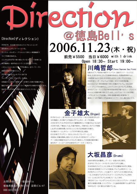 今日本のジャズシーンにおいてかなりの実力者3人が DIRECTION(ディレクション)というバンドで徳島にやってきます。 ハモンドオルガン・サックス・ドラムというかなり異色な取り合わせで、 どんな音が繰り広げられるんだろうとどきどきするバンドです。 DIRECTION(ディレクション)プロフィール メンバー:川嶋哲郎(Tenor/Soprano Saxophone, Flute) 金子雄太(Organ) 大坂昌彦(Drums) 2004年3月、名古屋で行われたライブセッションで意気投合しレギュラーユニット化。 サックス・オルガン・ドラムという珍しい楽器編成でライブ活動を始
