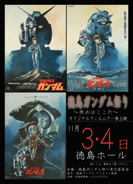 突然のイベント立て失礼します。 劇場版3部作を映画館でもう一度みたくないですか? ガンダムはファーストいいと常々言っているのですが、恥ずかしながら映画館で3部作を見たことが無い。いや、?がは幼いときに見に行った筈なんですが、どうも記憶があやふや。 いまさらながら「みたいなぁ」とふつふつも思い、だめもとで映画館や配給元に交渉してみました。 すると・・・おっけ〜!になったんです。 と、言うわけで、四国の徳島という地方都市ですが、本物の映画館で「ファースト3部作」を上映することになりました。 11月3・
