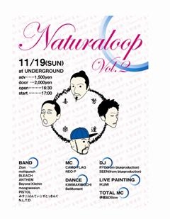 『NATURALOOP vol.2』 11月19日(日) underground adv・・・¥1500 door・・・¥2000 (共に1D付き) open・・・16:30 start・・・17:00 BAND≫ Zion mohipunch みす☆ぱんてぃ☆すとっきんぐ BLEACH PISTOL moog;seesion Beyond Kitchin ANTHEM N.L.T.D MC≫ NEO-P CAMO-FLAG DANCE≫ KIMIMAKIBOCHI BelMoment DJ≫ RYO(blueproduction) SEEN(blueproduction) LIVE PAINTING≫ IKUMI Total MC≫ 伊蔵&D5low お問い合わせ≫ ザイオンHP http://hp31.0zero.jp/573/skzion/ un-det