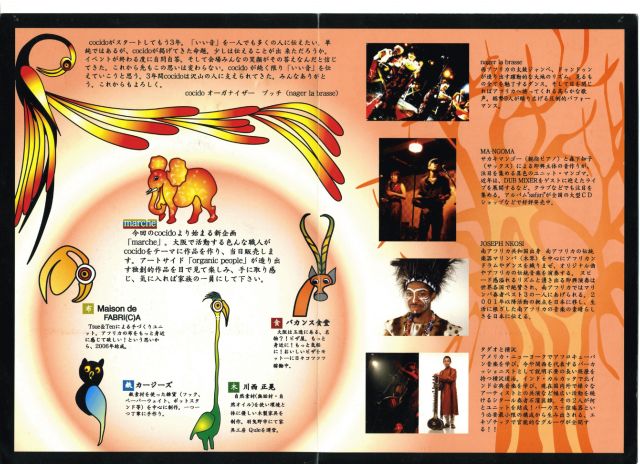2004年にmopよりリリースされたコンピレーションCD「cocido」が好セールスを記録し、大阪では常識となりつつある、民族ごった煮イベント「cocido -organic people gathering」今回はcocido3周年+10回目のダブルaniversarry!!という事でスペシャルなラインナップが実現!今回よりスタートする新企画「marche」と共に、絶対に見逃せないイベントです!!
