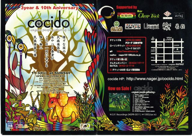 2004年にmopよりリリースされたコンピレーションCD「cocido」が好セールスを記録し、大阪ではいまや常識となりつつある、民族ごった煮イベント「cocido -organic people gathering」今回はcocido3周年+10回目のダブルaniversarry!!という事でスペシャルなラインナップが実現!!今回よりスタートする新企画「marche」と共に、絶対に見逃せないイベントです!!