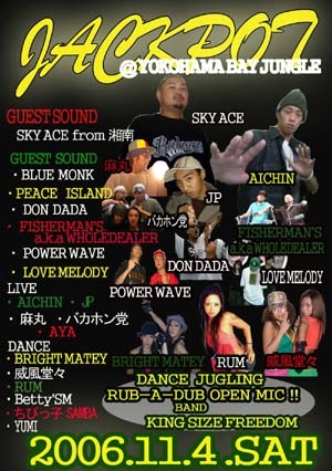今月のJACKPOTは「REGGAE」です! 生バンドでRUB A DUB,DANCE SHOW CASEでのお客さんのVIBESを一番上げたDANCERに衣装プレゼント!! セクシーコスチュームによるテキーラガールも参加!! 楽しみましょ〜! 「JACKPOT」@YAKOHAMA BAY JUNBLE 2006,11,4(SAT) OPEN:23:00~ DOOR:?2500(1D) W/F?1500(1D) ☆GUEST SOUND SKY ACE from 湘南 BLUE MONK PEACE ISLAND ☆BAND KING SIZE FREEDOM ☆SOUND DONDADA FISHERMAN'S aka WHOLE DEALER POWER WAVE LOVEMELODY SOUND ☆LIVE AICHIN 麻丸 JP バカホン党 ☆DANCER