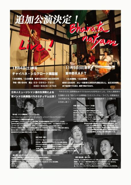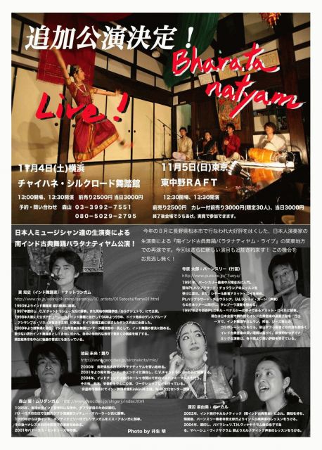 Live! バラタナティヤム http://www.geocities.jp/shigerji/bhratalivehp.html 今年の8月に長野県松本市で行なわれ大好評をはくした、日本人演奏家の生演奏による『南インド古典舞踊バラタナティヤム・ライブ』の関東地方での再演です。今回はさらに新しい演目も追加されます! 11月4日(土) 横浜チャイハネ・シルクロード舞踏館。 1300開場1330開演 前売り2500円当日3000円。 11月5日(日) 東京、東中野RAFT。1230開場、1330開演、 前売り2500円、カレー付前売り3000円(限定30人) 当日3000円 終了