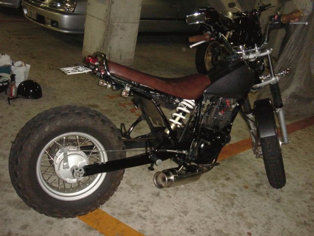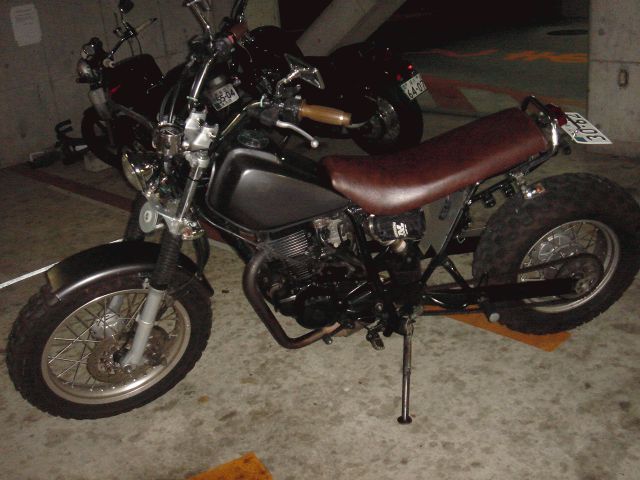 TW225になります。見てのとうり改造点多数です。 (ロンスイ20センチ、ダウンマフラー、デイトナメーター、シートこげ茶に張替え、メッキミラー、タンデムバー、グリップ、アルミマットガード、ディスクブレーキ、タンク自家塗装ガンメタ、エアーフィルター、ブロックタイヤなど?)フォーンのカバー外れていますが問題はないです。 走行距離は1万2000キロくらいになります☆ですのでまだ?ばり?好調です。エンジンはバッテリーが弱い為キック中心になります。 値段は15万円くらいを希望しております☆なるべく近県の方でお願いいたしま