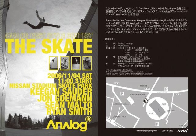 アパレルブランドのANALOGが日本で初めてのスケートイベントを開催します。 場所は新横のスケボー広場です。 当日はANALOGライダーのBrian sumner、Ryan Smith他のANALOGチームも来場します。 スケートをして一日楽しもうという趣旨のイベントです。 お友達と一緒に参加してください。 ちなみにベストトリックコンテストも行われる予定で、優勝者には賞金が10万円でます。コンテストは3回あるので、チャンスは3回あります。 外人ライダーの滑りを見れるチャンスです、皆さん遊びに来てくださいね。