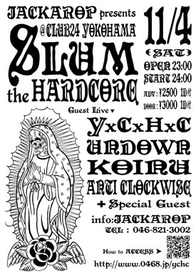 告知お願いします!! 11/4(SAT) 『SLUM the HARDCORE』@CLUB24 YOKOHAMA OPEN-23:00 START-24:00 ADV:\2500(1D付) DOOR:\3000(1D付) GUEST LIVE: ・UNDOWN from YOKOHAMA ・KOINU from TOKYO ・ANTI CLOCKWISE ・YxCxHxC (http://mixi.jp/view_community.pl?id=394015) &SPCIAL GUEST!! チケット予約&infoはJACKAROPまで! INFO:JACKAROP TEL:046-821-3002 MAIL:info@jackarop.com 詳しい詳細 ≪JACKAROP BLOG≫ http://www.jackarop.com 写真 10/14@CLUB24 YOKOHAMA ≪SLUM