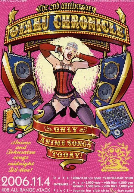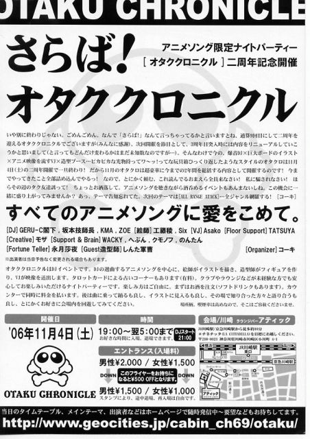 10月15日のオタクロトークも終わりまして。 いよいよ11月 4日は一晩中のアニソンパーティ、 OTAKU CHRONICLE! 今回のテーマは "ALL RANGE ATACK"、 アニソン全ジャンル網羅してアニメソング 聴きながら遊ぶナイトパーティー、 アニメ好きもアニソン好きもみんな川崎に集まれ! イベント開催概要は以下となります。(フライヤーから抜粋) ■OTAKU CHRONICLE #8 -ALL RANGE ATACK- 開催日:2006年11月4日(土) 19:00〜翌5:00、All night (途中退場、再入場フリー) 入場 :男性\2,000/女性\1,500円 男性\1,500