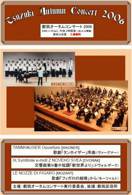 演目:ワーグナー:「タンホイザー」序曲 ドヴォルザーク:交響曲第9番「新世界より」 モーツァルト:歌劇「フィガロの結婚」より (合唱付) 指揮:末永隆一 合唱指導 : 橋本剛 出演:都筑オーケストラ、混声合唱団「夢のつづき」 入場:無料 主催:都筑オータムコンサート実行委員会 後援:都筑区役所 昨年までは都筑区区民祭りの一環として開催していましたが、本年からはオーケストラ・合唱団のメンバーで構成された都筑オータムコンサート実行委員会主催ということになりました。 今年はモーツアルトイヤー(