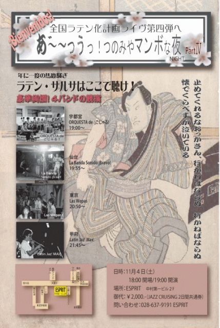 ORQUESTA de ごじゃる!の『へなちょこら〜て』と 申します。 宇都宮の、年に一度のとっても熱い夜のPRです! :::::::::::::::::::::::::::::: 『あ”〜〜っ うっ!つのみや MAMBOなNIGHT4』 (UTSUNOMIYA JAZZ CRUSING vol.2) 日程 11/4(sat) open 18:30 start 19:00〜 会場 宇都宮『ESPRIT』 http://www3.zero.ad.jp/esprit/ 入場料 2000円 タイムスケジュール 19:00〜 ORQUESTA de ごじゃる!(宇都宮) http://www101.sakura.ne.jp/~orquesta/ 19:55〜 La Banda Sonido Bravo!(仙台