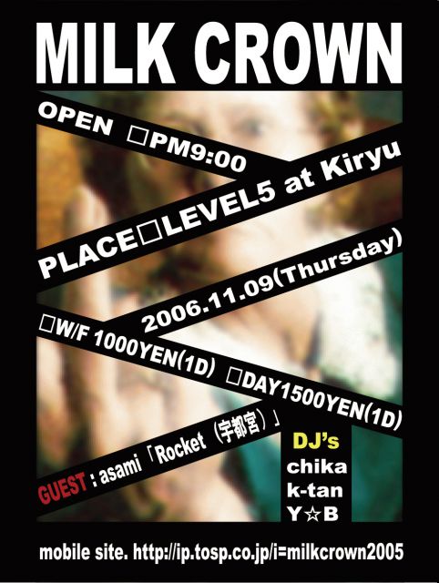 告知失礼します♪ いよいよMILK CROWNまで1週間になりました!! ROCK!ロック♪ROCK☆ いよいよ今年最後のMILK CROWNが迫ってきました! 今回は宇都宮からDJ asamiを迎えてのアゲアゲRock Party 11月9日(木) GUEST DJ : asami (宇都宮 Rocket) PLACE:Kiryu LEVEL5 start 21:00〜 W/F ¥1000(1D) DAY ¥1500(1D) before 22:00 1DRINK SURVICE 先着15名様にSTAFF SELLECTION CDプレゼント HP→ http://ip.tosp.co.jp/i.asp?i=milkcrown2005 MIXIコミュニティ→ http://mixi.jp/view_community.pl?id=414865