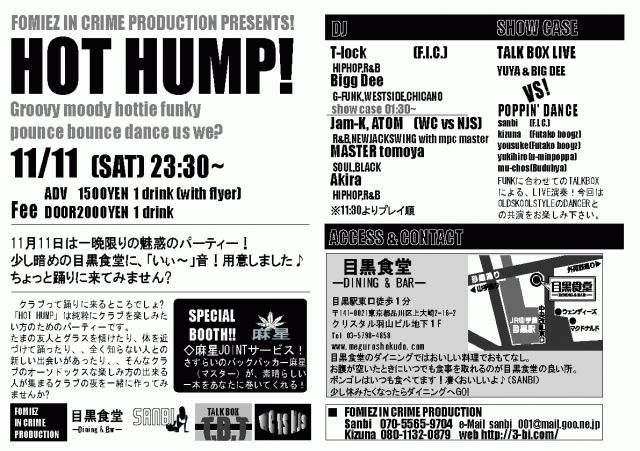 この秋、目黒食堂でパーティーします!! クラバー集合のパーティーです。 RAPとか歌とか無いのでとにかく踊れます! −DJ、Showcase紹介− http://3-bi.com/hothump/ −概要− Fomiez in Crime production presents! ■Hot Hump!■ 11月11日は一晩限りの魅惑のパーティー! 「HOT HUMP」は純粋にクラブを楽しみたい方のためのパーティーです。 たまの友人とグラスを傾けたり、体を近づけて踊ったり、全く知らない人との新しい出会いがあったり、そんなクラブのオーソドックスな楽しみ方の出来る人が集まる夜を一緒に作っ