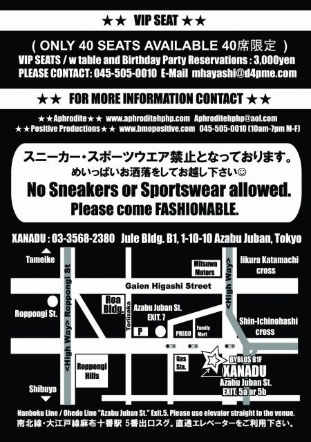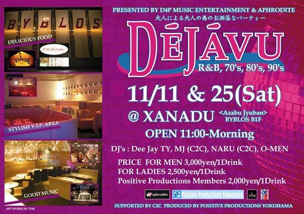 今週の土曜日に麻布十番のXANADUでちょっと大人なドレスアップパーティーをやっちゃいます。 11/11 SAT "DEJA VU" @ Xanadu in 麻布十番 ★★先月から始まった新しいイベントです。ドレスアップ系のお洒落な大人なパーティーです。R&B・HIPHOP 70's 80's 90's の超懐メロもかなりかかります。最近のクラビングにちょっと飽き気味の方も絶対楽しめますよ。特にNew Jack Swing世代のあなた!!泣きますよ〜(笑)★★ エントランス ladies \2500 1drink付き men \3000 1drink付き →ゲストリストの方は¥2000になります。 スニーカー・