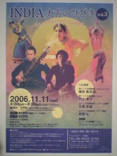 前回、正に大好評だったイベント「INDIA 太古のひびき」が再び開催されます!!前回は前売りでほぼソールドアウト状態だったので、前回見逃した方も今回は絶対にお見逃し無く!!!! 今回も最後にはみんなで踊りましょう☆☆ India 太古のひびきvol.3 〜ちょっとおそいスペシャル秋祭り〜 【時間】開場/pm.3:00 開演/pm.4:00 終演/pm.8:00 【場所】世界館(大阪市港区波除6-5-15) http://www.andaman-p.com/sekaikan01.html 【入場料】前売り/\1800(電話、メール予約) 当日/\2200