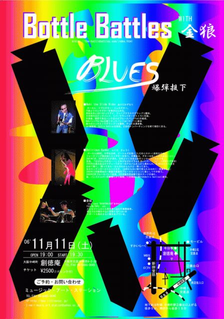 Bottle Battles with 金狼 BLUES爆弾投下 ■06.11.11(土) OPEN 19:00 START 19:30 ■大阪中崎町 創徳庵 大阪市北区中崎西4-2-30 TEL/FAX 06-6485-0045 ■2500円(1ドリンク付) ■お問い合わせ ミュージック・アート・ステーション 創徳庵 TEL/FAX 06-6485-0045 E-mail music_art_station@yahoo.co.jp HP: http://mas.littlestar.jp/ Bottle Battles HP http://the-bottlebattles.com/index.html