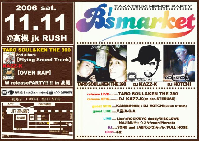 告知しつれいします。 TARO SOUL &KEN THE 390>DJ KAZZ-K リリースパーティーを高槻でやっちゃいます。 A-Q-Aは二部のおいしいとこ!! 今週末!!!どうぞ。 B'SMARKET @jk RUSH TARO SOUL&KEN THE 390 2ndalbum[Flying Sound Track] KAZZ-K[OVER RAP] W release party in高槻!!! release LIVE:TARO SOUL&KEN THE390 release SPIN:KAZZ-K(zz pro. STERUSS) guest SPIN:DJ KAN(韻踏合組合)/DJ HOTCHI(LOCK STOCK) guest LIVE:八空/A-Q-A LIVE:Lion'sROCK/BYG daddy/DISCLOWS/NAJIMI/チョウスケ va