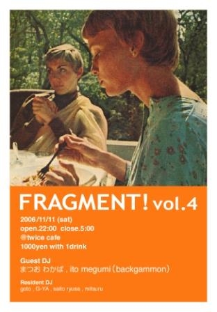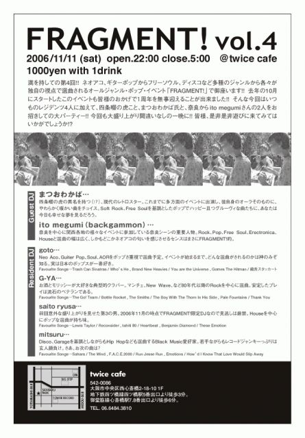 FRAGMENT! vol.4 2006/11/11 (sat) open.22:00 close.5:00 @twice cafe 1000yen with 1drink Guest DJ まつおわかば ito megumi (backgammon) Resident DJ goto G-YA saito ryusa mitsuru 満を持しての第4回!! ネオアコ、ギターポップからフリーソウル、ディスコなど多種のジャンルから各々が独自の視点で選曲されるオールジャンル・ポップ・イベント「FRAGMENT!」で御座います!! 去年の10月にスタートしたこのイベントも皆様のおかげで1周年を無事迎えることが出来ました!! そんな今回はいつものレジデンツ4人に加