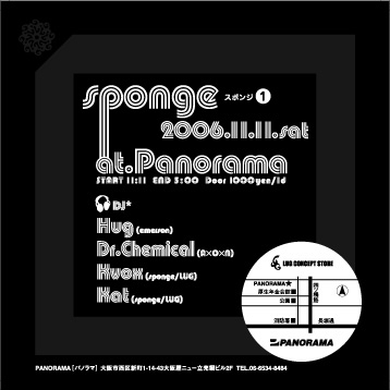 ■ sponge ■ 2006.11.11.sat @ panorama start11:11 end5:00 door 1000yen/1d dj Hug (emerson) Dr.Chemical (AxOxN) Kvox (sponge/LUG) Kat (sponge/LUG) vj Mitsuharu