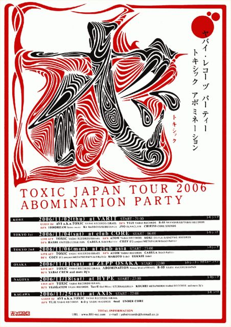今年の夏、初の野外フェスティバルを成功させた、YABAI RECORDSが秋のスペシャルパーティーを開催します! 今回は、夏のフェスで最高のライブを披露し、その日一番の盛り上がりを見せたTOXICが、ファーストアルバム「SABOTAGE」と供に登場! それに加え、デビューアルバムが世界中でヒットしたイスラエルの新星ABOMINATION、そして我等がYABAI RECORDSからはB-55が新曲を引っ提げて登場します! さらに、パーティーを盛り上げるために、VJ、デコレーション、レーザーとの見事なまでの融合によって、今までに見たことも無いようなYABAI空間を演出し、
