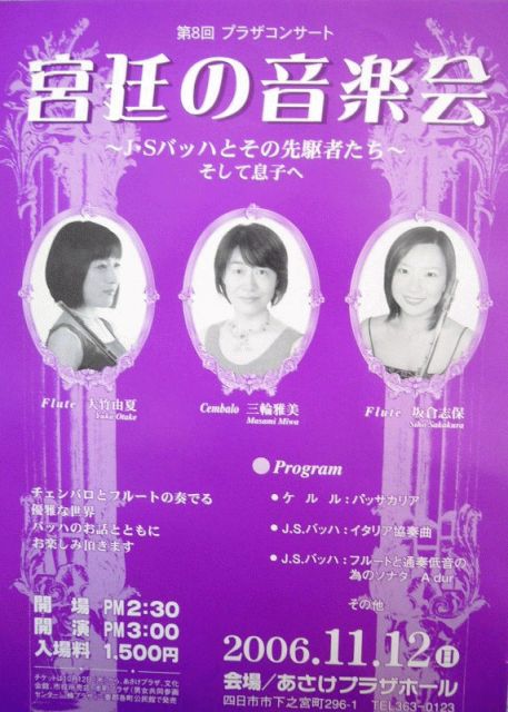 秋の休日にチェンバロとフルートの音を聴きませんか? 桑名市在住のチェンバロ奏者 三輪さんと、フルート奏者 大竹さんに加え、地元四日市在住のフルート奏者が出演する演奏会です。 チェンバロとフルートの奏でる優雅な世界。 バッハのお話とともにお楽しみいただきます。 11月12日(日) 開場14時30分 開演15時 入場料 1500円 チケット当日受付にご用意することも出来ます。 お問い合わせはトピ主まで。