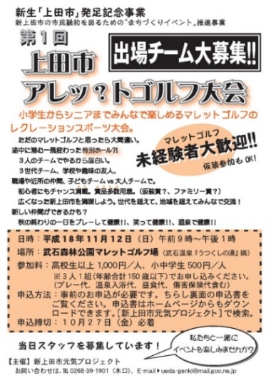 参加定員に達していないので申し込み期限を延長します。 是非お知り合いにもご紹介いただき、ご参加ください。場所が遠く感じられるけど、上田駅あたりから30分はかかりません。 大人1人1000円でプレーと温泉入浴券、昼食が付いているので参加するだけで元が取れてしまいます。(道具も無料貸出決定) さらに賞品は多くの方にご協力いただき、参加全チームに渡るよう準備してます。お得なイベントです。 お申込は http://www.kiguchi.info/cgi/mousikomi/form.cgi からできます。ご参加待ってます! 主催:新上田市元気プロジェクト
