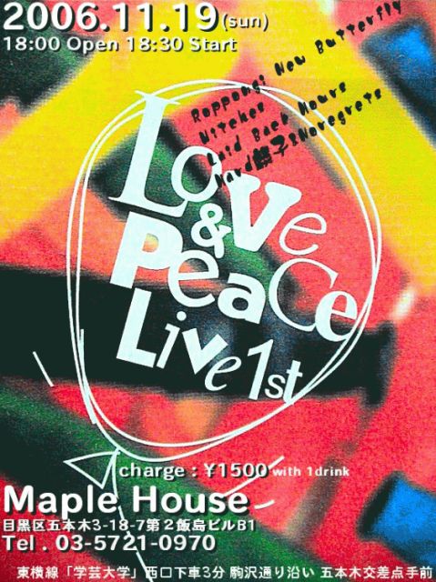 laid_back_Hours LIVEのお知らせです。 日時2006.11.19 18:00open 18:30start 場所 Maple House 学芸大学 目黒区五本木3-18-7第2飯島ビルB1 03−5721−0970 Charge : 1500yen/ with 1drink 出演 roppngi New butterfly Witches Laid Back Hours Hard 卍麟子&noregrets