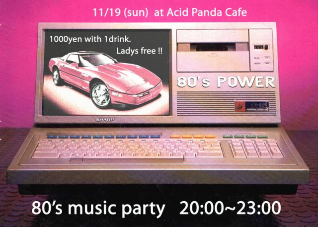 11/19(日) 80's POWER vol.6 \1000 1drink付 Ladys entrance free!! 20:00〜23:00まで 月一日曜日にやってくる80年代洋楽で踊れる日! ついに半年を迎えて6回目! 前回から80'sを中心に他の年代もスパイスとして 加えながら贈る、終電までのダンスパーティ! クラブトロピカーナのドリンクはフリー! とワム!は歌ってるが、ドリンクは一律500円! でもレディースは入場料がフリー! ヤッター!君の彼女はタダで入れるのさ! よし!日曜日のデートのシメはここに決めた! [レギュラーDJ] Slasher 大月支店長 フランク重虎 [ゲ