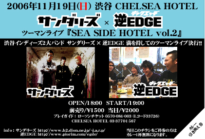 【会場】 渋谷チェルシーホテル 【前売り・当日券】 1500/2000yen 【出演】 サンダリーズ 逆EDGE 【OPEN/START】 18:00/19:00 【備考】 フライヤー持参の方はカレー1杯無料