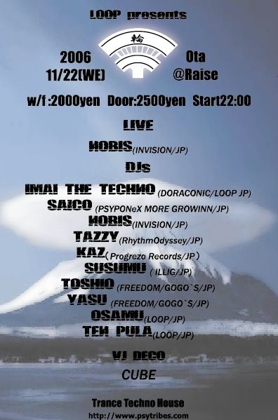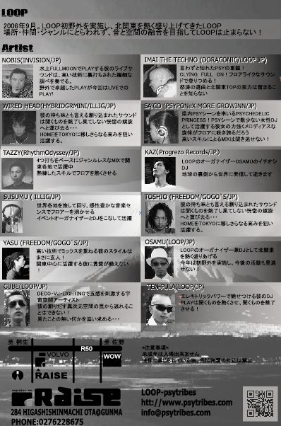 センセーショナルなイベントをクリエイトし 超絶映像と異次元空間を発信する! 今夏の野外レイブでさらにパワーアップ! 北関東No.1の圧倒的なクルー! ジャンルレスに活動する-LOOP-が11月22日に300人を収容する太田Raiseでイベントを行います! 勤労感謝の日の前日の夜(水曜日) 日頃のハードな仕事の疲れを吹っ飛ばす! ハイパーな夜で身も心もリフレッシュしましょう! 2006/11/22(水曜日) @Raise DOOR 2500yen W/F 2000yen OPEN22:00 サイケ&プログレッシブ!! LOOP -輪- ■LIVE■