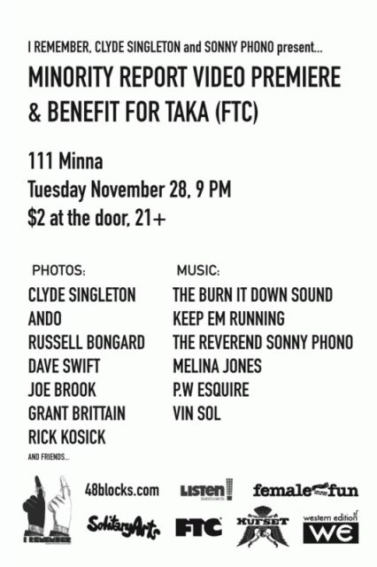 I REMEMBER、Clyde Singleton、Sonny Phonoによる MINORITY REPORTというSK8ビデオのプレミア試写イベントが、サンフラン シスコの111 Minna ギャラリーというところで来たる11月28 日(火曜日)に行われます。そしてそのイベントは収益が全て現在闘病 中の”Not-Feeling-So-Good”なBigTaka(FTC)へ 寄付されるっていう粋なチャリティーイベントなんです!NIKEか らはレアなスニーカーもオークションで出品!!行くっきゃない。 FTCのFは、ファミリーだ! 詳細は、こちらで・・・ http://www.speksjapan.net/ 主催者のANDOからコメントで