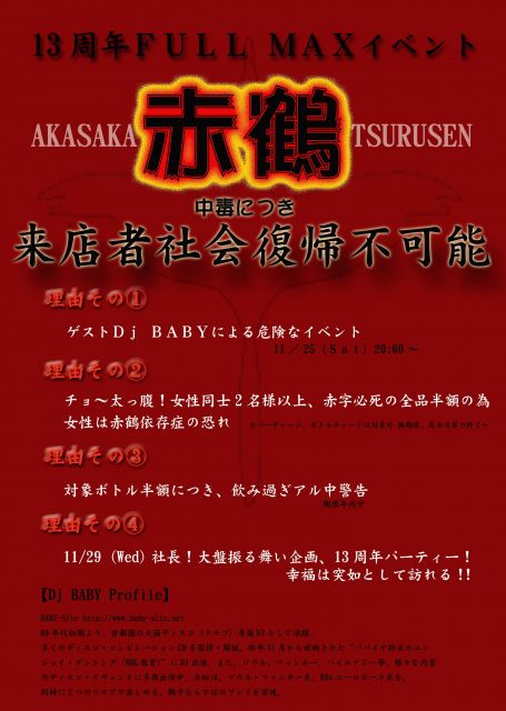 ●Dj BABY プレゼンツ! イベント名:Two Face ! 11月25日20:00 Door Open! ♂3000yen with2drink ♀2000yen with2drink ★40代?それともまだ30代? 3F 40代以上のアナタへ70s〜80sのサーファーディスコを中心にファンキーな夜をお贈りします。 4F 30代のアナタへ80sハイエナジー、ユーロビート中心にイケイケな夜をお贈りします。 80年代初期より、首都圏の大箱ディスコ(クラブ)専属DJとして活躍。多くのディスコ・コンピレーションCDを監修・解説。昨年11月から放映された“パパイヤ鈴木のエンジョイ・ダンシング(NH