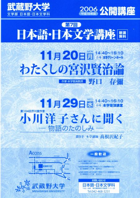 武蔵野大学の公開講座です。 小川洋子さんをお迎えして、対談というか、インタビュー形式でお話を伺います。 聴講無料、お申し込みは不要です。 たくさんの方のご参加をお待ちしております。 アクセス等は下記の武蔵野大学のページをご参照下さい。 http://www.musashino-u.ac.jp/index.html