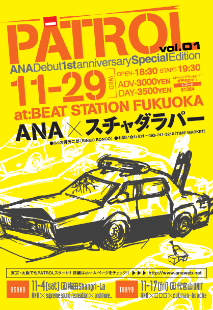 2006*11*29(wed) @福岡BEAT STATION < ANA Debut 1st anniversary Special Edition> open18:30/start19:30 adv \3,000 (Drink代別途) お問い合わせ:TIME MARKET 092-741-3210 LIVE: ANA スチャダラパー DJ : 宮野秀二郎(BINGO BONGO) ローソン Lコード81364 後援:MUSIC ON-TV!