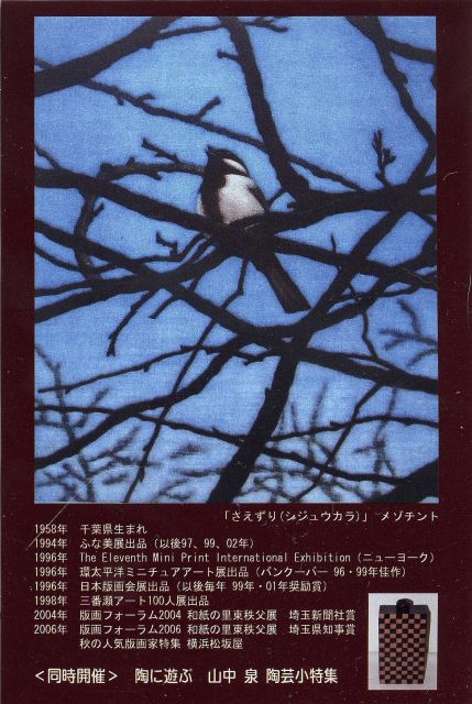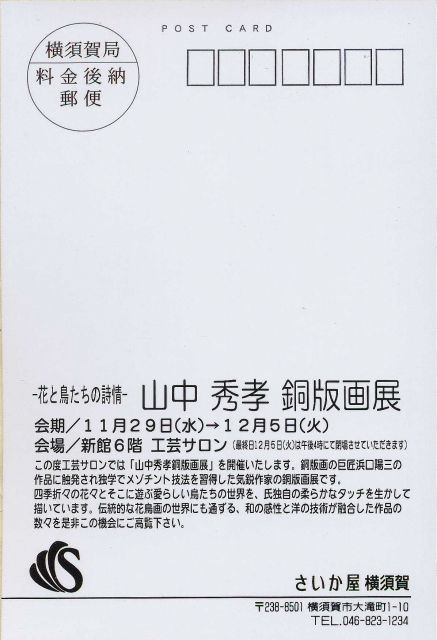 横須賀さいか屋新館6階の工芸サロンで 下記の展覧会を開催します。 山中秀孝 銅版画展 銅版画の巨匠浜口陽三の作品に触発され、独学で メゾチント技法を修得した気鋭作家の銅版画展です。 四季折々の花々とそこに遊ぶ愛らしい鳥たちの世界を 氏独特の柔らかいタッチを生かして描いています。 伝統的な花鳥画の世界にも通ずる、 和の感性と洋の技術が融合した作品の数々を 是非この機会にご高覧下さい。 会場 横須賀さいか屋 新館6階 工芸サロン 〒238-8501 横須賀市大滝街1-10 (代)04
