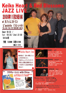 何度かコラボさせていただいているジャズシンガー、 Keiko heartさんとのコラボライヴです♪ 寒い夜、あたたかいライヴをみなさんと共有できたらと想っています♡ はあとちゃんブースも出現します 11/29(水) Keiko Heart&heartちゃん コラボジャズライヴ at ラシエット open 18:30 1st 19:30〜 2st 21:00〜 Keiko Heart&Red Blossoms vo Keiko Heart Pf 加藤英介 Bass 鉄井孝司 Ds 公手徹太郎 コラボレーション with chica M.Charge: 1ドリンク付き 男性2000円 女性1500円 (水曜のレディ