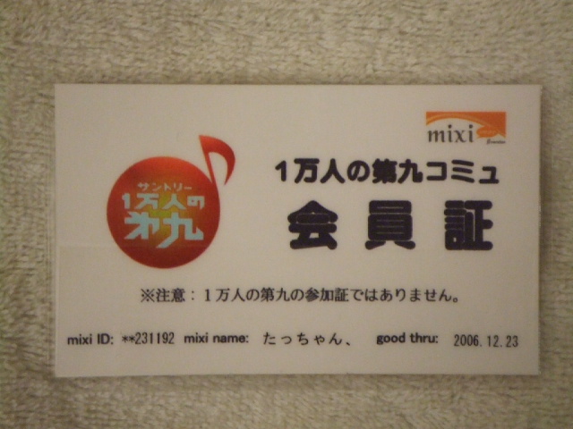 ただ今,1万人の第九コミュ(&ディズニー部)の 会員証を製作しております。 で,できれば,次のオフ会で配布できればな〜と 密かに企んでるのですが…。 ただ,コミュのメンバー全員分作るのは物理的に不可能なので, 希望者(オフ会によく参加する人,その他ぜひ欲しいという奇特な方) に,順次発行していこうと思ってます。 どんな会員証になる予定かは… ↓↓↓こちらをご覧ください↓↓↓ http://mixi.jp/view_bbs.pl?id=6904965&comm_id=187924 で,会員証をご希望の方は, [1]mixi name (定期的に名前を変えておられる